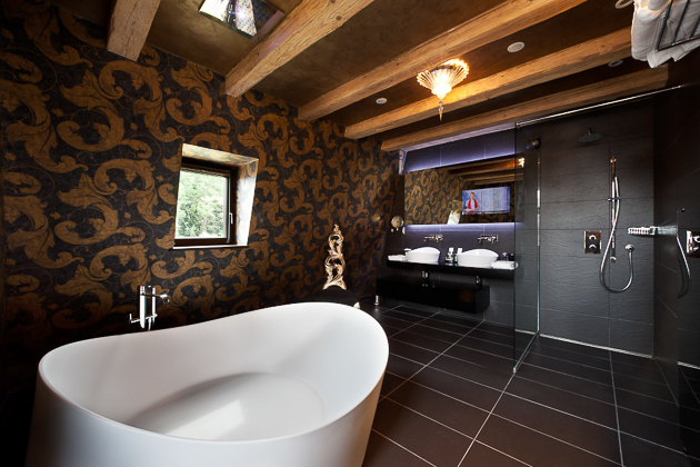 Intimité, confidentialité pour cette très belle suite luxueuse, aux teintes sombres et or avec une somptueuse baignoire ronde ciel de pluie au dessus et luminothérapie.